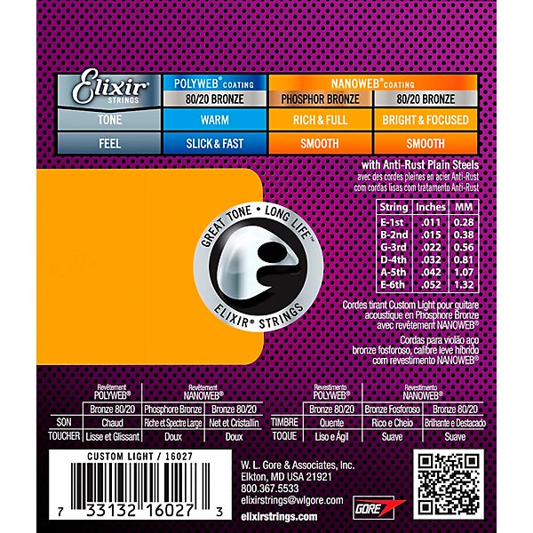 Elixir Strings 16027 Nanoweb Phosphor Bronze Acoustic Guitar Strings | CUSTOM LIGHT 11-52
